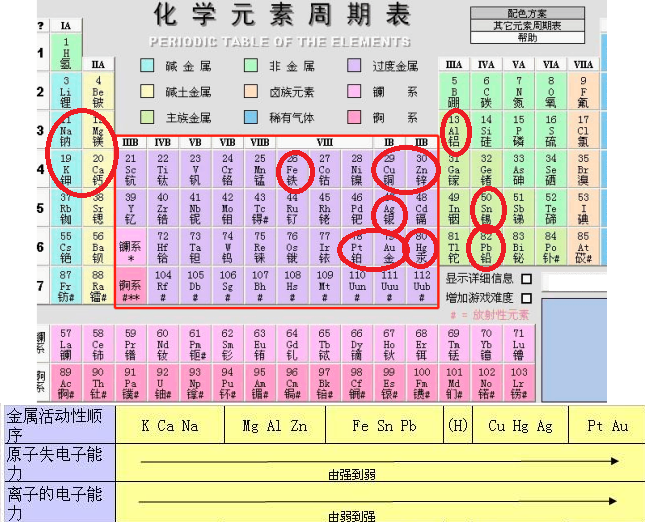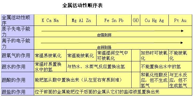 金属活动性指金属单质在水溶液中失去电子生成金属阳离子的倾向,属于热力学范畴。 利用金属活动性,可以比较金属在水中(而不是其他环境或干态)的还原性强弱与其对应的阳离子的氧化性强弱,预测水中一系列的置换反应的方向。 一般来说,元素周期表内元素从上到下,从右到左有活动性增强趋势,其本质原因是随着金属半径增大,最外层电子数减少,其电离能与升华能均有下降,虽水合热亦有下降,但前两者已足够弥补。但对于一些特殊的例子,如锂,由于其半径极小,水合热足够高,弥补了升华热与电离能偏高的不足,导致它在水中的活动性甚至比铯还要高。 金属活动性顺序:钾、钙、钠、镁、铝、锌、铁、锡、铅、氢、铜、汞、银、铂、金。 即K、Ca、Na、Mg、Al、Zn、Fe、Sn、Pb、(H)、Cu、Hg、Ag、Pt、Au。 在金属活动顺序表中,金属活动性是由强逐渐减弱,一般位置越后的金属,金属性越弱,原子的还原性越弱。例如:金属活动性:Sn>Pb,但元素的金属性:Pb>Sn。 由金属活动性顺序表可以得到以下结论: 1、排在前面的金属可以将排在后面的金属从它们的金属溶液中置换出来。(若金属过于活泼,则会直接与水反应,并不会与水中的金属离子反应); 2、理论上讲,金属活动性表中铁及排在其前的金属均可置换出纯水中的氢; 3、若只考虑氢离子的氧化性,排在氢前的金属才能和非氧化性酸反应,置换出氢; 4、排在越后的金属越容易,也越先从它们的化合物中被置换出来;排在越前的金属越容易,也越先把其他化合物中的金属置换出来。