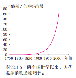 历史上许多民族都将太阳作为顶礼膜拜的神明。如果没有太阳,地球就会处在黑暗和冰冷的长夜中,也不会孕育出任何生命。 实际上,宇宙中除了太阳还有无数的恒星,那些恒星离我们非常遥远,所以看起来没有太阳那么大、那么亮。太阳是离地球最近的一颗恒星。许多恒星比太阳还大。每颗恒星都在释放巨大的能量,它们每时每刻都在向外辐射着惊人的光和热 。 太阳和其他恒星为什么会辐射如此巨大的能量?人类利用的能量都是由太阳提供的吗?人类使用的能量是无穷无尽的吗?让我们在本章中一起探索这些有趣的问题吧! 三峡水电站是世界上最大的水力发电站,它通过提高上游的水位增加水的势能,高水位的水向下流,使水轮机转动并带动发电机发电,从而向人们提供电能。 金属的冶炼、机器的运转、汽车和火车等交通工具的行驶都需要能量,生活中烧饭、取暖、照明等也需要能量。生产和生活中利用的这些能量,是通过不同的能源提供的。各种能源的广泛利用,极大地促进了人类文明的发展。 自从原始人发现使用火的方法以后,能源就成为人类文明跃进的重要物质基础。让我们沿着这个进步历程来认识各种各样的能源。 钻木取火在人类利用能量的历史上非常重要。 从利用自然火到利用人工火的转变,结束了远古人类茹毛饮血的时代,开启了以柴薪作为主要能源的时代。 相对于当时的人口和当时的生产力,柴薪是一种数量巨大、能够方便获取的能源。 人类以柴薪为主要能源的时代,持续了近一万年。 现在,柴薪仍是某些地区的重要生活能源。 蒸汽机的发明是人类利用能量的新里程碑。 人类从此逐步以机械动力代替人力和畜力,人类的主要能源由柴薪转向煤。 我们今天使用的煤、石油、天然气, 是千百万年前埋在地下的动、植物经过漫长的地质年代形成的,所以称为 化石能源。 像化石能源这样可以直接从自然界获得的能源,我们称为 一次能源。 风能、水能、太阳能、地热能以及核能等均属于一次能源。 电能不属于一次能源,它通常是由其他形式的能转化而来的, 最终还要转化为光能、内能、动能等其他形式的能,才能为人类所用。 那么,为什么很多地方要使用电能,而不直接使用一次能源呢? 这是因为 电能便于输送和转化。现代社会离不开的各种各样的用电器, 是将电能转化为其他各种形式能量的转化器。由于电能无法从自然界直接获取, 必须通过消耗一次能源才能得到,所以称电能这样的能源为 二次能源。 由于世界人口的急剧增加和经济的不断发展,能源的消耗持续增长。 特别是近几十年来,能源消耗增长速度明显加快。 如果把全世界的能源消耗量折合成热值为2.93×10 ▲7 J/kg的标准煤来计算, 1950年为26亿吨,1987年为110多亿吨,2003年接近140亿吨,2007年达到160亿吨(图22.1-5)。