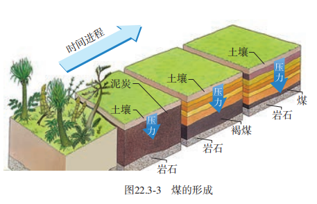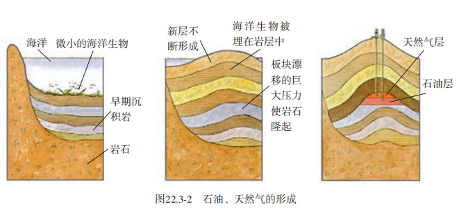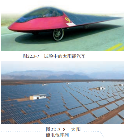 |  太阳——巨大的“核能火炉” 太阳距地球1.5 亿千米,它的直径大约是地球的110倍,体积是地球的130万倍,质量是地球的33万倍,核心的温度高达1 500万摄氏度(图22.3-1)。在太阳内部,氢原子核在超高温下发生聚变,释放出巨大的核能。 因此可以讲,太阳核心每时每刻都在发生氢弹爆炸,比原子弹爆炸的威力更大。 .png)  太阳核心释放的能量向外扩散,可以传送到太阳表面。 太阳表面温度 约6000 °C,就像一个高温气体组成的海洋。大部分太阳能以热和光的形式向四周辐射开去。太阳这个巨大的“核能火炉”已经“燃烧”了近50亿年。目前,它正处于壮年,要再过50亿年才会燃尽自己的核燃料。那时,它将膨胀为一个巨大的红色星体……  太阳是人类能源的宝库 太阳向外辐射的能量中,只有约20亿分之一传递到地球。太阳光已经照耀我们的地球近50亿年。地球在这50亿年中积累的太阳能是我们今天所用大部分能量的源泉。 以化石能源为例。煤、石油、天然气是地球给人类提供的最主要的一次能源。 远古时期陆地和海洋中的植物,通过光合作用,将太阳能转化为生物体的化学能。 在它们死后,躯体埋在地下和海底,腐烂了。沧海桑田,经过几百万年的沉积、化学变化、 地层的运动, 在高压下渐渐变成了石油和煤(图 22.3-2 和图22.3-3)。在石油形成过程中还放出天然气。 今天,我们开采化石燃料来获取能量,实际上是在开采上亿年前地球所接收的太阳能。      太阳能的利用 人类除了间接利用存贮在化石燃料中的太阳能外,还设法直接利用太阳能。目前直接利用太阳能的方式主要有两种,一种是用集热器把水等物质加热(图22.3-5),另一种是用太阳能电池把太阳能转化成电能(图22.3-6)。   平板式集热器的箱面是玻璃,内部有涂黑的吸热板, 可以吸收太阳辐射并转化为内能,从而将集热器管道内的水流加热。 太阳能电池可以将太阳能转化为电能,供我们使用。 太阳能电池具有使用寿命较长、没有污染的优点,但是,它的 转化效率较低, 而且每个太阳能电池产生的电压较低。太阳能电池不仅用于照明、计算器、手表等耗电少、工作电压低的用电器,还广泛应用在航天、通信等领域。我国部分太阳能发电站已并入电网,成为电力供应的来源之一。   参考资料:  第3节 (太阳能) |