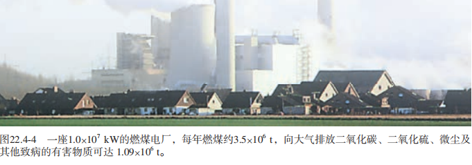 既然能量是守恒的,为什么我们还常说要节约能源呢? 我们知道,在热传递的过程中,热量只能自发地从高温物体转移到低温物体,不能相反。如果要使热量从低温物体流向高温物体,就需要消耗其他形式的能量,例如电冰箱就需要消耗电能。 同样,汽车制动时,由于摩擦,动能转化成了轮胎、地面和空气的内能,这些消耗的能量不能再自动地用来驱动汽车(图22.4-1)。 可见,涉及热现象的能量转化过程是有方向性、不可逆的,消耗掉的内能不能被收集起来再利用。实际上,能量的转化、能量的转移,都是有方向性的,人们是在能量的转化或转移的过程中利用能量的。有些能量可以利用,有些则不能。能源的利用是有条件的,我们所能利用的能源是有限的,所以需要节约能源。 人类在耗用各种能源时,不可避免地会对环境造成影响。例如,化石能源产生了大量的内能,其中相当一部分没有被利用,从而造成了热污染。汽车尾气(图22.4-2)就是造成城市热岛效应的罪魁祸首之一。不仅如此,由于现代生活中化石能源的广泛使用,燃料的燃烧产生了大量的二氧化碳,也大大加剧了地球的温室效应。 除了二氧化碳以外,作为热机燃料的煤、石油、天然气等燃料往往含有杂质,致使燃烧生成的气体中含有二氧化硫等有害物质。燃烧时的高温还会促使氮氧化物的生成,燃料的不完全燃烧能产生粉尘和一氧化碳。产生的酸性气体最终会形成酸雨,可致水、土壤酸化,对植物、建筑物、金属构件造成危害(图22.4-3)。全世界因使用煤、石油等燃料,每年排入大气的有害物质达几亿吨之多。这些烟尘废气排放到大气,污染了大气(图22.4-4)