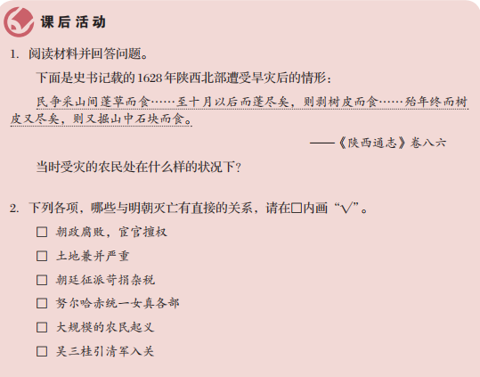 明朝曾是当时世界上最强大的国家,经济繁荣,文化昌盛。 然而,种种社会矛盾,使它逐步走向覆亡。明朝是如何衰败的?又是怎样被农民起义推翻的? 政治腐败与社会动荡 明代中后期,社会经济虽有明显的发展,但政治日益腐败。 皇帝多是沉迷享乐,疏于朝政。如明神宗在位 48 年,竟然有 20 年不上朝, 不批奏疏,致使不少机构瘫痪,政事乏力。当时皇室内部又钩心斗角,纷争不已, 大臣们更是结党营私,争权夺利。 相关史事 明武宗将政事交给宦官刘瑾处理, 自己在宫中纵情享乐,还四出游玩,甚至公开抢掠民女。 明熹宗爱好木工,成年累月像木匠一样制作木器,朝政全都交给宦官魏忠贤。 于是,魏忠贤权倾朝野,人称“九千岁”。 ![]() 朝政的混乱,造成中央对社会的控制力不断下降,法纪松弛, 各级官吏贪赃枉法,对民众百般盘剥。皇室贵族、宦官、官僚、地主等疯狂兼并土地, 肆意侵占民田,致使大量农民流离失所。 ![]() 李自成起义推翻明朝 明朝末年,政治腐败越发严重,国家财政危机深重, 朝廷不断加派赋税 ①,民众不堪重负,怨声载道,阶级矛盾异常尖锐。 当时陕西北部一带连年大旱,庄稼颗粒无收,饥民遍野,官府不顾民众死活,催征如故。 灾难深重的广大农民再也无法忍受下去,纷纷举行起义,反抗朝廷的统治。 在各支农民起义军中,李自成的队伍发展迅速,成为起义的主力军。 ① 当时除了原有的征税,还加派了对辽东作战的“辽饷”、训练军队的“练饷”和镇压人民起义的“剿饷”,合称“三饷”。 人物扫描 李自成出身于陕西米脂县的一个农民家庭, 童年给地主放羊,长大后当过兵。陕西爆发农民起义后,他投奔起义军。 由于他英勇善战,被称为“闯将”。后来他成为起义队伍的领袖,人称“李闯王”。 ![]() 李自成率领农民起义军进入中原以后,提出“均田免赋”的口号, 得到广大农民的热烈拥护,队伍很快发展到 100 多万人。 李自成规定了严明的军纪,不许妄杀一人,不得侵占民房,严禁抢掠, 还向贫苦民众发放钱粮。起义军英勇作战,纵横于河南、湖广等 10 余省。 1644 年,李自成在西安建立政权,国号大顺。接着,李自成挥师北上,直抵北京。 1644年4月,百万大军在李自成的统一指挥下,对北京城发起猛烈进攻, 不到两天就攻进城内,明朝末帝崇祯在绝望中自缢。统治长达276年的明王朝,最终被农民起义推翻了。 ![]() 材料研读 当时流行这样的歌谣:“杀牛羊,备酒浆,开了城门迎闯王,闯王来时不纳粮。” “朝求升,暮求合,近来贫汉难存活。早早开门拜闯王,管叫大小都欢悦。” 想一想:广大民众为什么欢迎和拥护李自成的起义军? 满洲兴起和清兵入关 明朝后期,活动于我国东北地区的女真族不断发展壮大。 1616 年,努尔哈赤统一了女真各部,建立政权,国号大金,史称后金。 努尔哈赤率军与明朝交战,接连取胜,使明朝的北部受到严重威胁。 努尔哈赤死后,皇太极继位,继续进攻明朝。1635 年,皇太极改族名为满洲; 次年,改国号为清。 明朝灭亡以后,正当李自成力图推进全国统一的时候, 驻守重镇山海关的明军将领吴三桂降清,引清军入关,并与清军联合夹击李自成的军队。 李自成在山海关交战失利,退回北京,随即离京西行,转战各地,最后失败。 ![]() 这是清初的皇宫,建成于1636年,有 300多间房屋。 在国内现存的皇宫建筑中,它的规模仅次于北京故宫。 ![]() 知识拓展: 八旗制度 努尔哈赤在统一女真各部的过程中,建立了八旗制度, 把所属人员编为八个旗,将生产、行政、军事三种功能结合在一起,实行“兵民合一”, 军政一体,旗人“出则为兵,入则为民”,大大提高了战斗力,推动了满族社会经济发展。 清朝建立对全国的统治以后,旗人享有政治、军事和经济上的许多特权。 直到清朝后期,旗人还享受官俸,但他们早已没有了当年的勇猛善战, 而是养尊处优,败落无能。后来,人们还把享有特权而又不务正业的人称作“八旗子弟”。 |