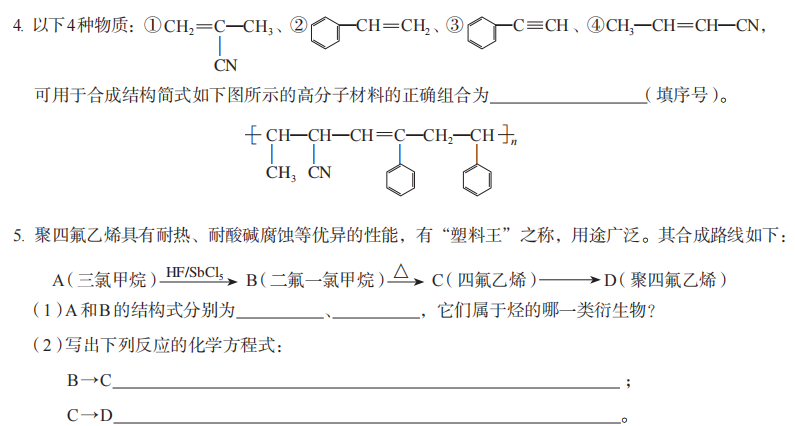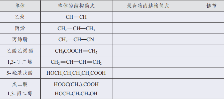 高分子科学从诞生到现在还不足百年,但完整的高分子材料工业体系已经建立。除了塑料、合成纤维、合成橡胶三大合成材料,现代高分子材料正向功能化、智能化、精细化方向发展,出现了具有光学、电学、生物医学、吸附分离等功能的高分子,与能源、国防、航空航天、电子信息、医疗健康和现代农业等领域的需求密切相关。 高分子的组成和结构特点决定了高分子的性质,是确定高分子合成方法及应用领域的基础,也是我们学习和认识高分子的基本视角。 ![]() 高分子的合成是利用有机化合物相互反应的性能,得到相对分子质量较大的高分子的过程。高分子的相对分子质量比一般有机化合物大得多,通常在104以上;一般有机化合物的相对分子质量具有明确的数值,而高分子的相对分子质量却是一个平均值,因为聚合反应得到的是分子长短不一的混合物。 合成高分子的基本方法包括加成聚合反应与缩合聚合反应,前者一般是含有双键的烯类单体发生的聚合反应,后者一般是含有两个(或两个以上)官能团的单体之间发生的聚合反应。 高分子 macromolecule 单体 monomer 聚合物 polymer 一、加成聚合反应 我们已经知道,氯乙烯在一定条件下,可以通过相互加成的方式连接成链状的高分子聚氯乙烯。 ![]() 氯乙烯在这里发生的是加成聚合反应(简称加聚反应)。该反应中的原料氯乙烯称为单体,生成的聚氯乙烯称为加成聚合物(简称加聚物)。聚氯乙烯分子链中可重复的结构—CH2—CHCl—称为链节,又称重复结构单元,含有的链节数目称为聚合度,以n表示。 聚合物的平均相对分子质量 = 链节的相对质量 × n 二、缩合聚合反应 我们曾经学习过乙酸与乙醇在酸催化下发生的酯化反应,该反应是可逆反应,移除反应生成的水,可以促进平衡向生成乙酸乙酯的方向移动。 ![]() 如果用二元酸和二元醇代替一元酸和一元醇进行以上反应,如己二酸与乙二醇在酸催化下发生酯化反应,则生成连接成链状的聚酯。 ![]() 这种由单体分子间通过缩合反应生成高分子的反应称为缩合聚合反应(简称缩聚反应)。在生成缩合聚合物(简称缩聚物)的同时,还伴有小分子的副产物(如H2O等)的生成,这是缩聚反应与加聚反应的重要不同之处。一般的缩聚反应多为可逆反应,为提高产率,并得到具有较高聚合度的缩聚物,需要及时移除反应产生的小分子副产物。 加成聚合 addition polymerization 缩合聚合 condensation polymerization 加聚物 addition polymer 缩聚物 condensation polymer 书写缩聚物的结构简式时,一般在方括号外侧写出端基原子或原子团;而加聚物的端基不确定,一般不必写出。 ![]() 书写缩聚反应的化学方程式时,各单体物质的量与缩聚物结构简式的下角标一般要一致。例如,下列化学方程 式中两者都是n。另外,也要注意生成的小分子的物质的量:由一种单体进行缩聚反应,生成的小分子物质的量一般为n-1;由两种单体进行缩聚反应,生成的小分子物质的量一般为2n-1。例如: ![]() 德 国 化 学 家 施 陶 丁 格(H. Staudinger,1881—1965)早年曾在瑞士任教,1926年到德国弗赖堡大学任教,从事有机化学研究直至退休。在20世纪初期,多数学者认为树脂、橡胶等在溶液中是以小分子缔合形成的胶束形式存在。而以施陶丁格为代表的少数学者认为这些物质本身是由许多原子构成的大分子,这些大分子的溶液具有胶体性质,它与小分子缔合得到的胶体是不同的。1922 年,施陶丁格发表论文,提出了“聚合反应是大量小分子以化学键相互结合形成大分子的过程”假说,指出聚乙烯和天然橡胶等聚合物都是由众多小分子单体通过共价键连接形成的链状分子,为建立高分子科学奠定了基础。1953 年,施陶丁格获得了诺贝尔化学奖,以表彰他为建立高分子科学作出的贡献。 ![]() 1. 写出下表中聚合物的结构简式及链节。 ![]() 2. 写出下列聚合物单体的结构简式。 ![]() 3. 写出由下列单体聚合得到的聚合物的结构简式。 ①4-甲基苯乙烯 ②丙烯酰胺 ③1,1-二氯乙烯 ④乳酸(2-羟基丙酸) ⑤间苯二甲酸和1,4-丁二醇 ⑥丁二酸和1,6-己二醇 ![]() |